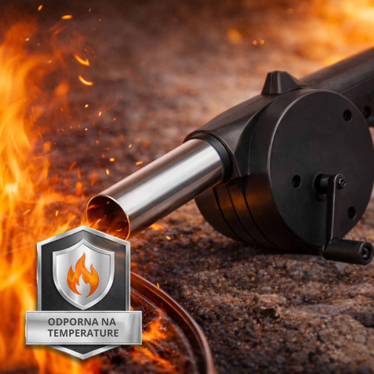Stalowa końcówka i trwała obudowa sprawiają, że dmuchawa wytrzyma wiele sezonów grillowych.